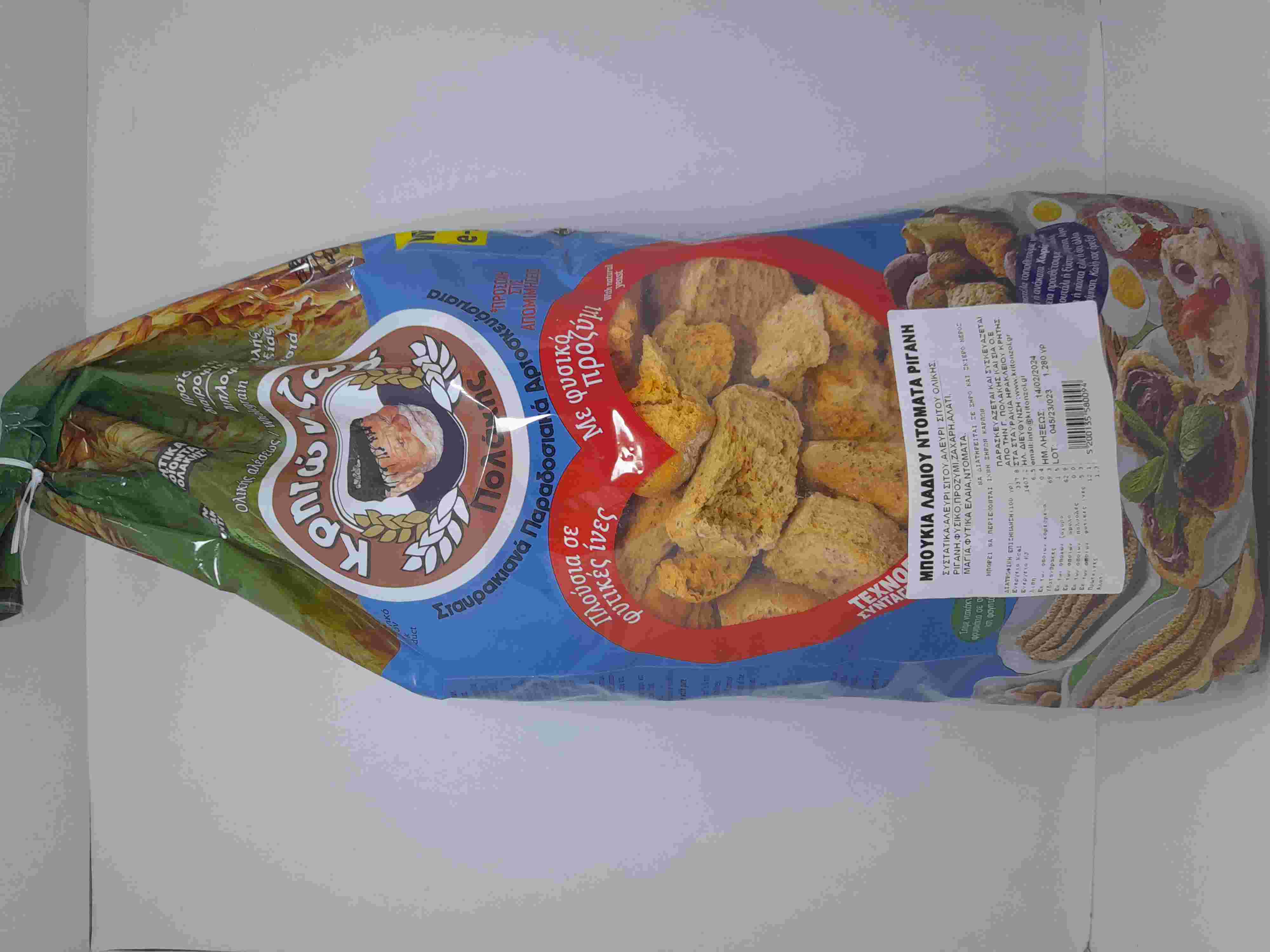 Με σταρένιο αλεύρι, ελαιόλαδο, ντομάτα, ρίγανη, προζύμι, μαγιά. Αφράτα και νόστιμα από την Κρήτη με γεύση ντομάτας και ρίγανης